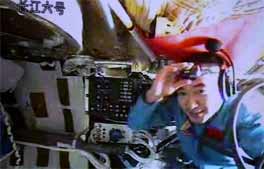 航天員翟志剛正在軌道艙測(cè)試天地通話(huà)的性能 中廣網(wǎng)記者南光 曹囡囡 攝