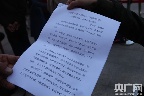 今年61歲的鄭成業(yè)老人在人群中格外顯眼,在這位老人手中拿著一份打印的文章——《一位資深老人的良言,獻(xiàn)給即將退休的老年朋友》。當(dāng)記者問道為什么選擇這樣一篇文章時(shí),老爺子深有感悟的說道“這篇文章是去年三月份我兒子在網(wǎng)絡(luò)上下載的,我看了之后受益匪淺,改變了我之前迷茫的生活狀態(tài)”