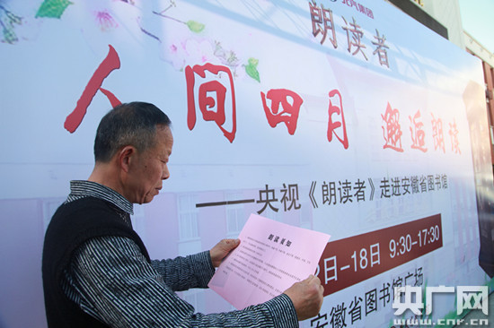 此次朗讀者在安徽省圖書館的活動(dòng)時(shí)間是4月12-18日每天9:30-17:30。很多由于時(shí)間原因而未能進(jìn)入朗讀亭的人徘徊在朗讀亭周圍而不肯離去?瓷现挥40歲左右而實(shí)際年齡已經(jīng)60多歲的張阿姨一臉遺憾的站在朗讀亭外喃喃自語道,今天來晚了呦,明天我要早點(diǎn)來排隊(duì)。