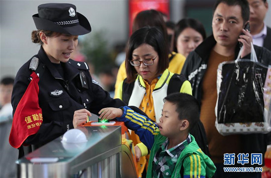 10月7日,在山西運(yùn)城北站,1名小朋友在執(zhí)勤民警的幫助下進(jìn)站。隨著國(guó)慶、中秋假期接近尾聲,全國(guó)鐵路迎來返程客流高峰。新華社發(fā)(鮑東升攝)