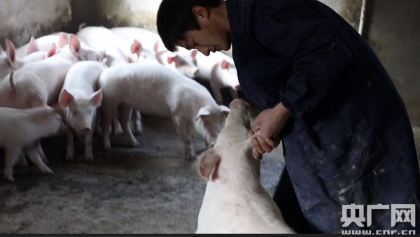 楊軍軍一入豬圈,豬仔們都湊過(guò)來(lái)(中央廣播電視總臺(tái)央廣記者 王妍 攝)