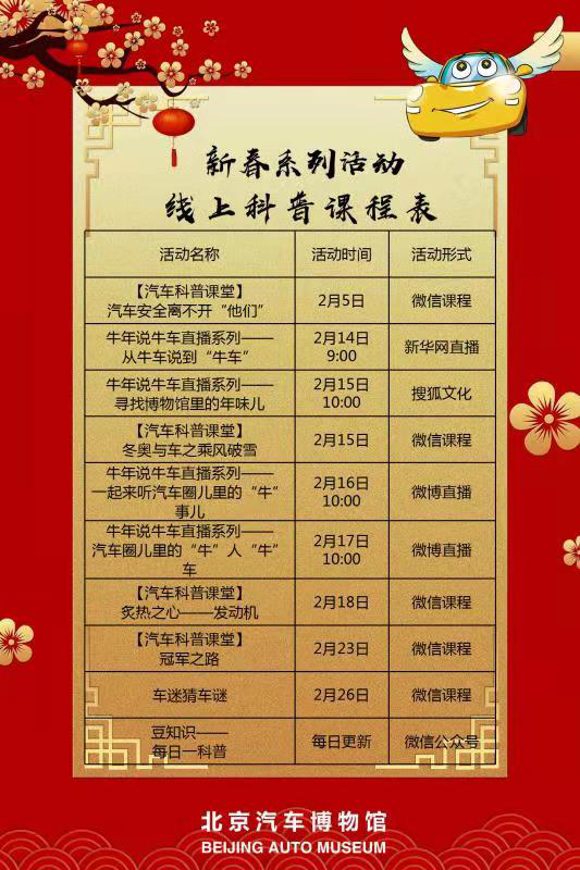 據北京汽車博物館相關負責人介紹,初三至初六以“牛年說牛車”為主題,每天一場直播講述汽車圈兒里的“牛”車、牛人、牛事兒。初三,科普老師講帶領大家從古代的牛車講到現在的“牛”車;初四,汽車博物館工作人員將帶領大家尋找汽博館里的年味兒,逛一逛博物館里的新春文創(chuàng)節(jié);初五,講解員以角色扮演的方式為大家?guī)硪粓銮榫笆街v解;初六,以新年特展“那些年,在路上”為主線帶大家看一看各個年代的經典車型,聊一聊汽車圈兒里的“牛”人“!笔聝。