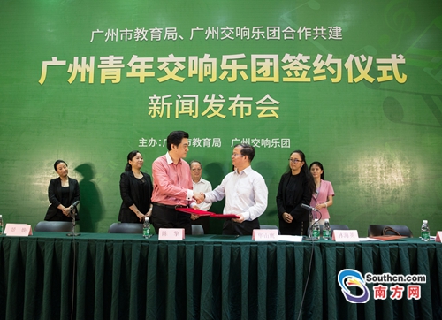 2012年5月,為提高廣州市青少年的藝術素養(yǎng),推進學校藝術教育普及工作和促進學校樂隊建設,廣州市教育局和廣州交響樂團共同簽署了首個五年合作協(xié)議書,決定在廣州交響樂附屬青少年樂團基礎上,合作共建廣州學生交響樂團。在圓滿完成2012-2017年度第一個五年合作計劃的基礎上,為促進廣州市學校藝術教育普及工作再上新臺階,雙方均同意進一步深化合作。同時,為適應國際化、專業(yè)化的發(fā)展需要,雙方同意將合作共建的“廣州學生交響樂團”更名為“廣州青年交響樂團”(以下簡稱“廣青交”)。7月19日,雙方共同簽署了新一輪合作協(xié)議。