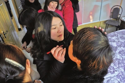 沒有專業(yè)的化妝師,村民吳紅的女兒義務(wù)為大家化妝