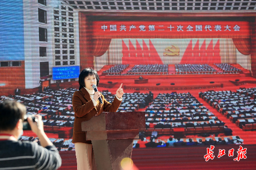音樂展示《國際歌》《春天的故事》《理想》、聽歌識曲《東方紅》《游擊隊歌》《紅梅贊》、湖北大鼓《二十大精神指航向》、全場合唱《沒有共產(chǎn)黨就沒有新中國》……課程圍繞黨的二十大主題、大會報告的主要內(nèi)容和核心要義進(jìn)行了系統(tǒng)闡述,同時音樂與黨課互相交融,現(xiàn)場觀眾在紅色經(jīng)典曲目中感受一幕幕或悲壯激烈,或輝煌壯麗的黨史畫卷。