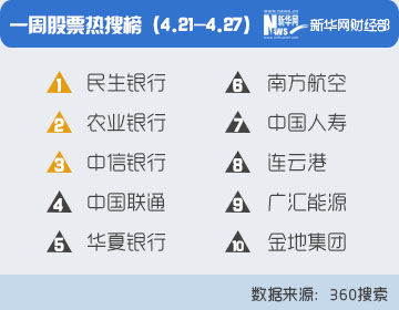 360搜索數(shù)據(jù)顯示,截至2014年4月27日,入選一周股票熱搜榜前10位的上市公司依次為:民生銀行、農(nóng)業(yè)銀行、中信銀行、中國聯(lián)通、華夏銀行、南方航空、中國人壽、連云港、廣匯能源和金地集團(tuán)。