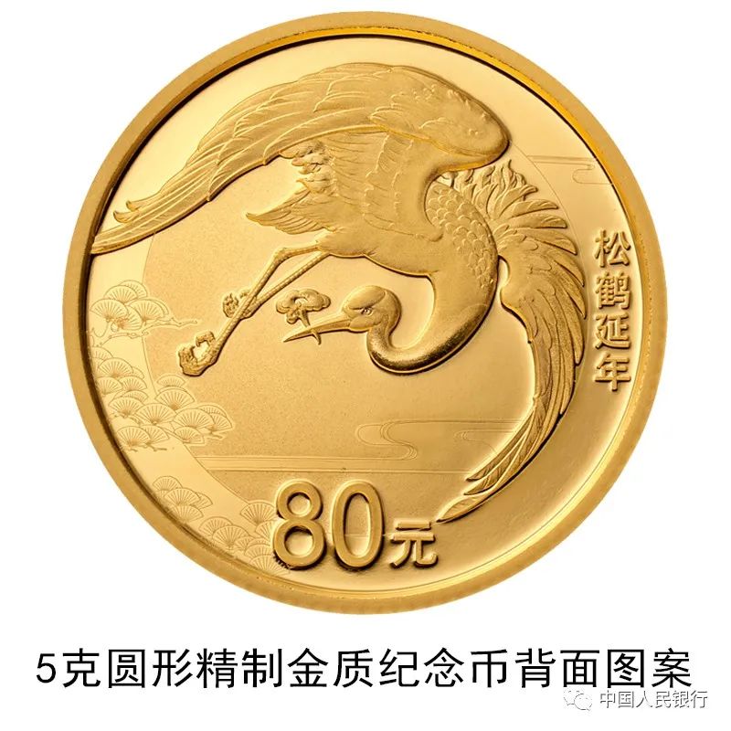 5克圓形金質(zhì)紀念幣背面圖案為松、鶴、靈芝、云紋等組合圖案,并刊“松鶴延年”字樣及面額。
