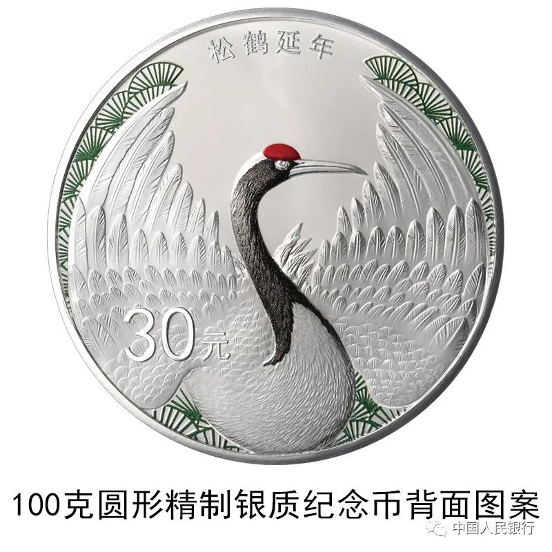 100克圓形銀質(zhì)紀念幣背面圖案為鶴與松枝等組合圖案,并刊“松鶴延年”字樣及面額。