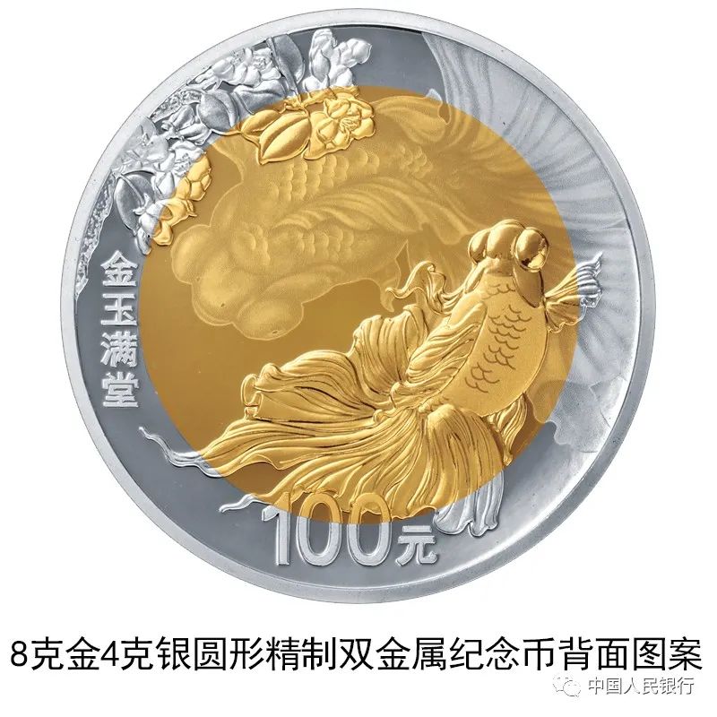 8克金4克銀圓形雙金屬紀念幣背面圖案為金魚與海棠花等組合圖案,并刊“金玉滿堂”字樣及面額。