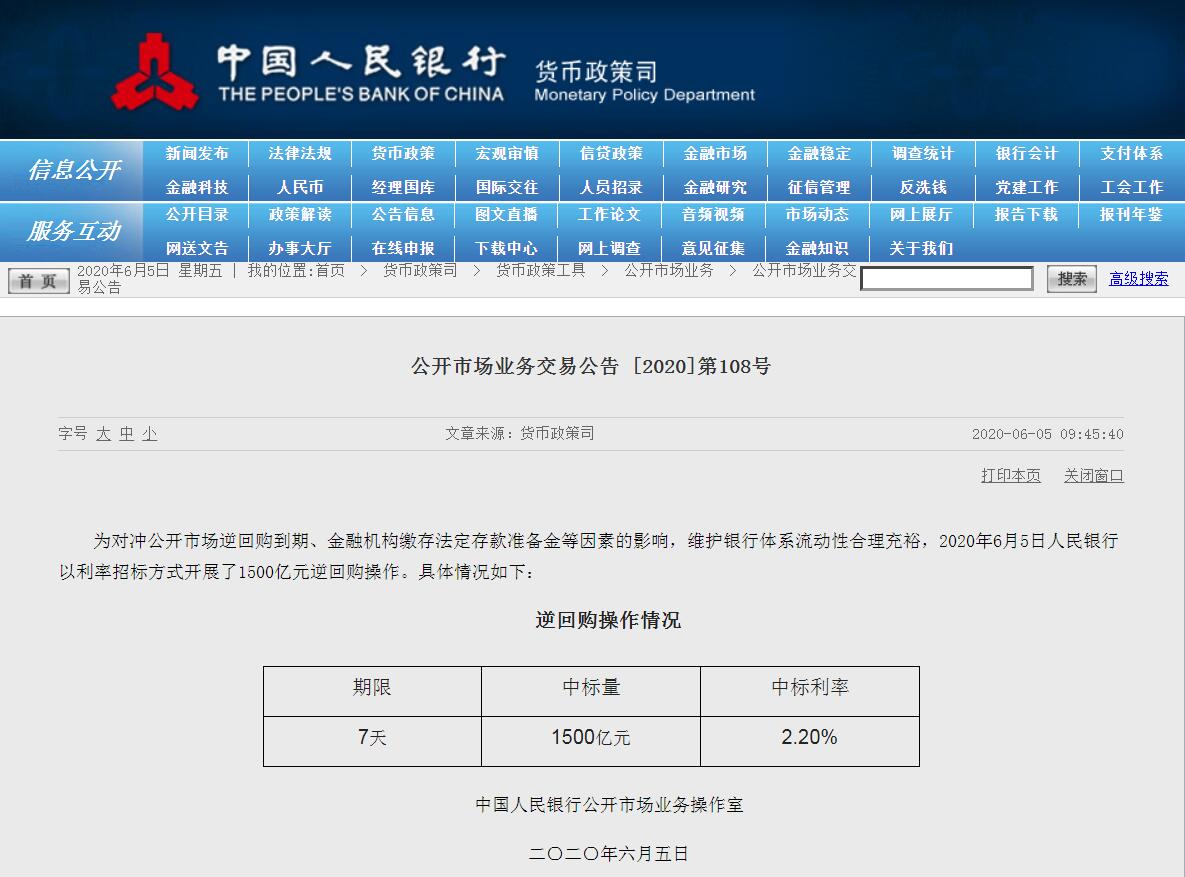 針對6月5日開展1500億逆回購,央行稱,此舉是為對沖公開市場逆回購到期、金融機構(gòu)繳存法定存款準備金等因素的影響,維護銀行體系流動性合理充裕,本次中標(biāo)利依然為2.2%,與4日持平。