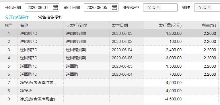 據(jù)Wind數(shù)據(jù)顯示,本周(6月1日-5日),央行累計進行逆回購操作2200億,逆回購到期6700億,公開市場本周凈回籠4500億元。