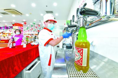 本報訊(實習(xí)記者 楊天悅)“記得小時候,家里大人們都是拿著暖壺來打鮮啤酒回家喝,好多年沒見著了!6日上午,一名正在北京稻香村第三營業(yè)部購買現(xiàn)打啤酒的市民回憶道。