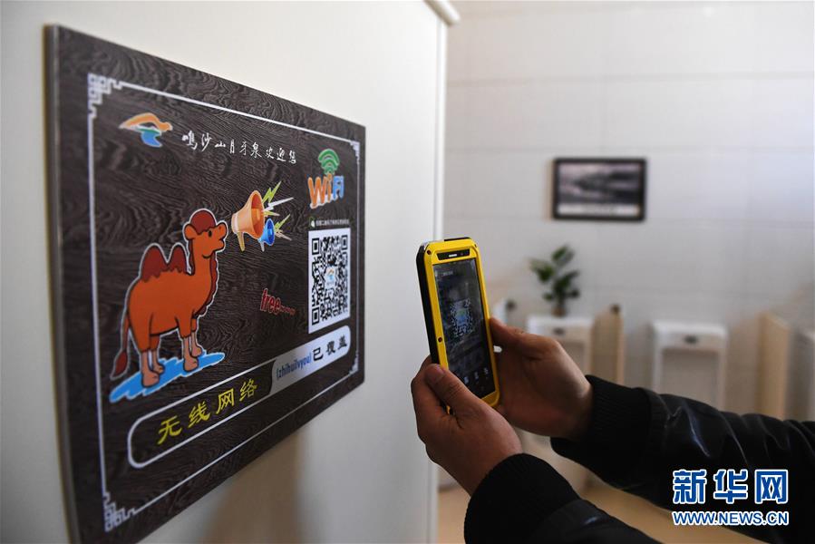 12月3日,游客在敦煌鳴沙山月牙泉景區(qū)衛(wèi)生間里用手機(jī)掃二維碼上網(wǎng)。新華社記者 陳斌 攝