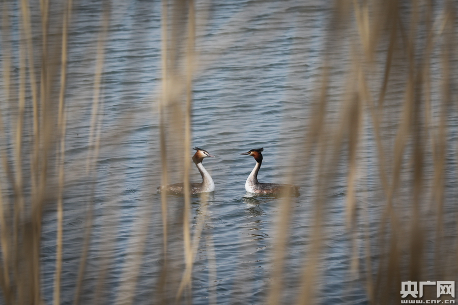 浮在水面上的兩只鳥引得游客拍照 (央廣網(wǎng)記者 韓靖攝)