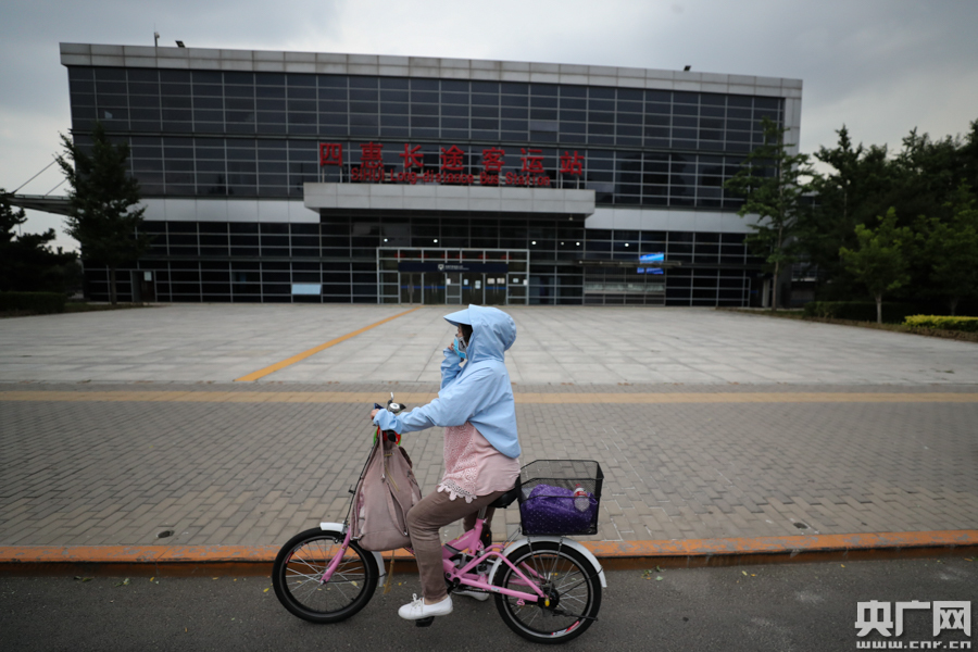 6月18日,一名行人正在四惠長(zhǎng)途汽車站外打電話(央廣網(wǎng)記者 韓靖 攝)