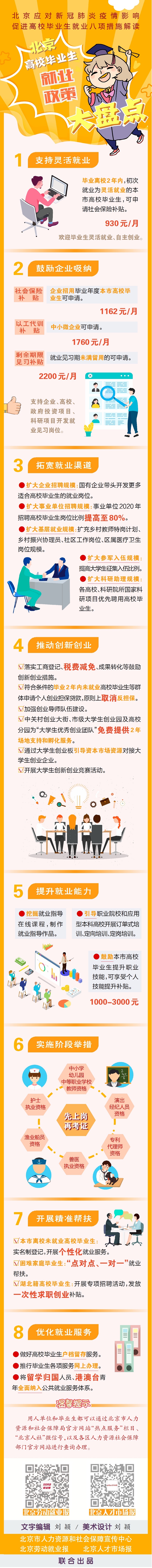 央廣網(wǎng)北京7月3日消息(記者劉一荻)為全力做好北京市高校畢業(yè)生就業(yè)工作,在新冠肺炎疫情防控關(guān)鍵時(shí)期,7月3日,北京市人力資源社會(huì)保障局、市教委和市財(cái)政局聯(lián)合發(fā)布《關(guān)于應(yīng)對(duì)新冠肺炎疫情影響促進(jìn)高校畢業(yè)生就業(yè)工作的若干措施》(以下簡稱“京8條”),從支持靈活就業(yè)、鼓勵(lì)企業(yè)吸納、拓寬就業(yè)渠道、推動(dòng)創(chuàng)新創(chuàng)業(yè)、提升就業(yè)能力、實(shí)施階段舉措、開展精準(zhǔn)幫扶、優(yōu)化就業(yè)服務(wù)8個(gè)方面,為高校畢業(yè)生就業(yè)創(chuàng)業(yè)提供政策支持,力爭年底實(shí)現(xiàn)北京生源高校畢業(yè)生就業(yè)率不低于95%。