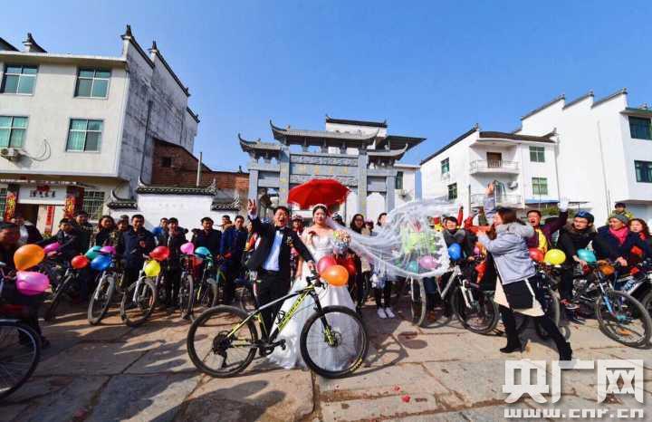 單車當(dāng)“寶馬” 幸福娶新娘(央廣網(wǎng)發(fā) 戴繼民 單長(zhǎng)華攝) 央廣網(wǎng)上饒2月8日消息(記者謝元森 通訊員戴繼民 單長(zhǎng)華)2月6日,一場(chǎng)浪漫環(huán)保的婚禮在江西省婺源縣賦春鎮(zhèn)舉行。新郎吳淦文別出心裁,沒有請(qǐng)豪華的迎親車隊(duì),而是讓幾十位車友騎著系有彩色汽球的單車組成迎親車隊(duì),接新娘吳小妹進(jìn)門。 -