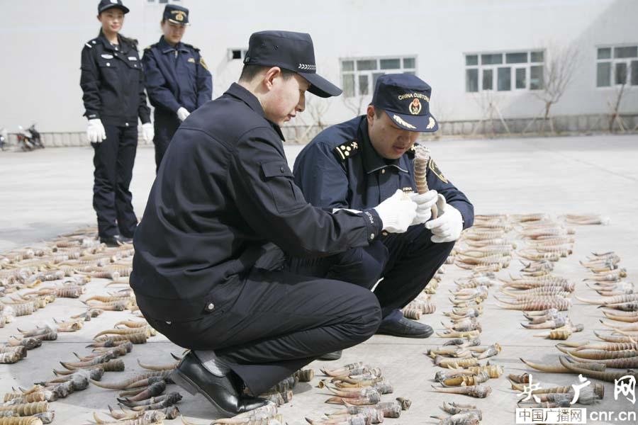 阿拉山口海關(guān)緝私關(guān)員正在清點(diǎn)查獲羚羊角(央廣網(wǎng)發(fā) 李琳攝)