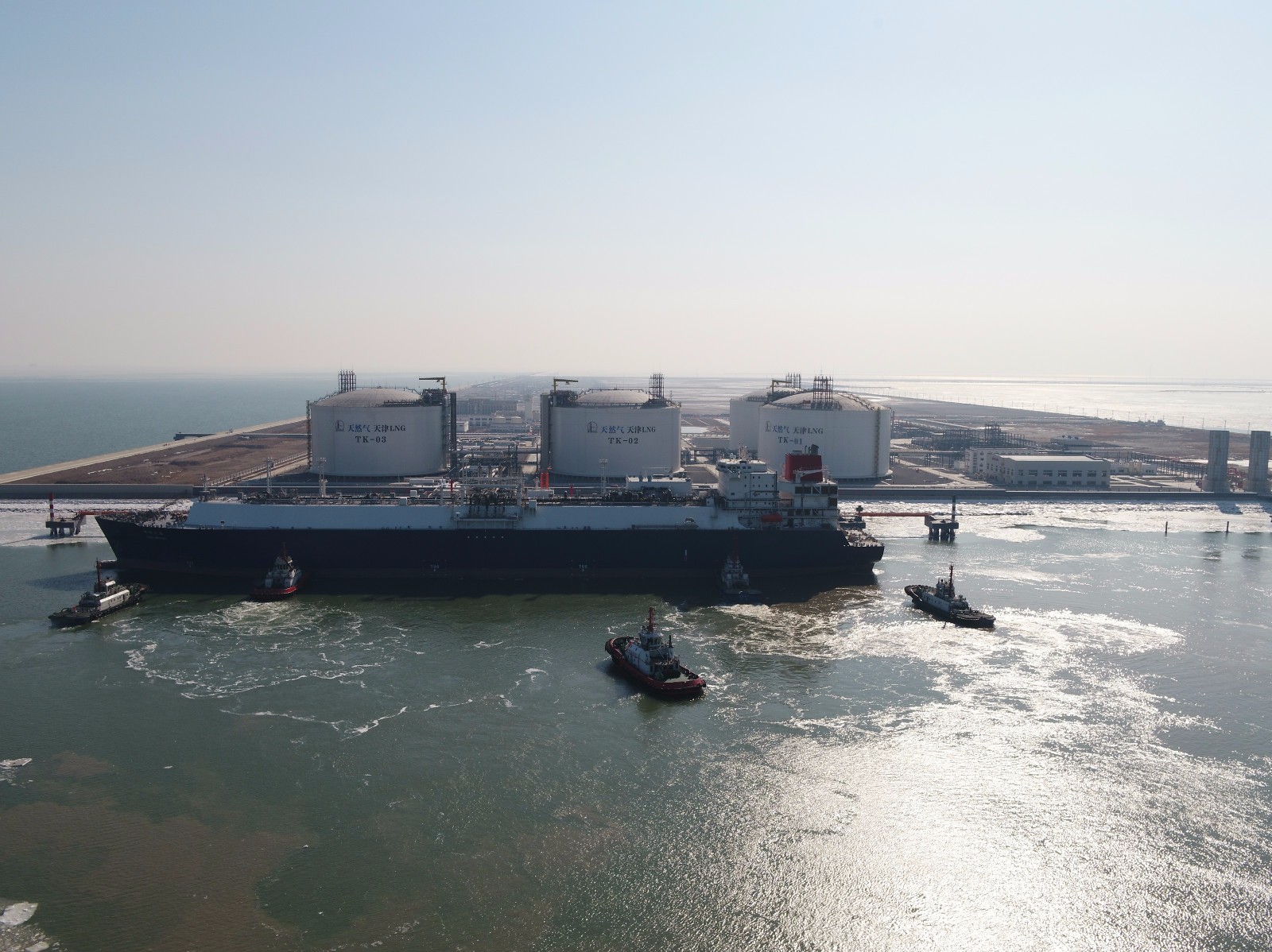 在天津海事船艇的護(hù)送下,載運(yùn)LNG(液化天然氣)的“中能北海”輪今天下午(2月6日)安全靠妥大港港區(qū)中石化天津LNG碼頭。這也是天津港大港港區(qū)通航后迎來的首艘LNG船舶。