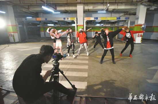 這幾天成都仍在經(jīng)歷寒潮,夜晚氣溫徘徊在2℃左右。晚上11點(diǎn),在春熙路的一個(gè)地下車(chē)庫(kù),這群學(xué)員們穿著露臍裝、超短褲,冷得瑟瑟發(fā)抖。晚上,他們要錄制一個(gè)韓國(guó)音樂(lè)舞蹈視頻。音樂(lè)響起,他們好像立馬不冷了,邊跳舞,邊對(duì)著鏡頭做表情。