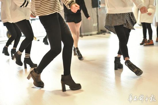 跟著趙老師走進(jìn)春熙路一處寫(xiě)字樓,剛出電梯,就聽(tīng)見(jiàn)韓流音樂(lè)聲。6個(gè)年輕女孩正準(zhǔn)備上舞蹈課,老師是來(lái)自成都某高校的兼職老師。女孩們化了妝,換上高跟鞋,人瞬間長(zhǎng)高了約12厘米。走在木地板上發(fā)出咔嚓咔嚓的聲音。音樂(lè)一響,她們馬上甩動(dòng)頭發(fā),動(dòng)作整齊劃一。