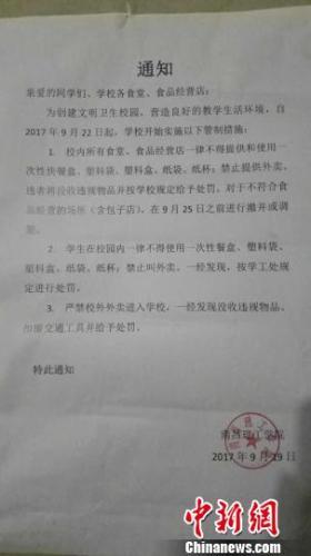 中新網(wǎng)南昌9月23日電(記者 華山)日前,江西南昌理工學(xué)院對(duì)全校學(xué)生、校內(nèi)所有食堂和食品經(jīng)營(yíng)店下發(fā)了一則通知,自9月22日起,要求校內(nèi)所有食堂及食品經(jīng)營(yíng)店,一律不得提供和使用一次性餐具、塑料袋等,并嚴(yán)禁外賣進(jìn)校。