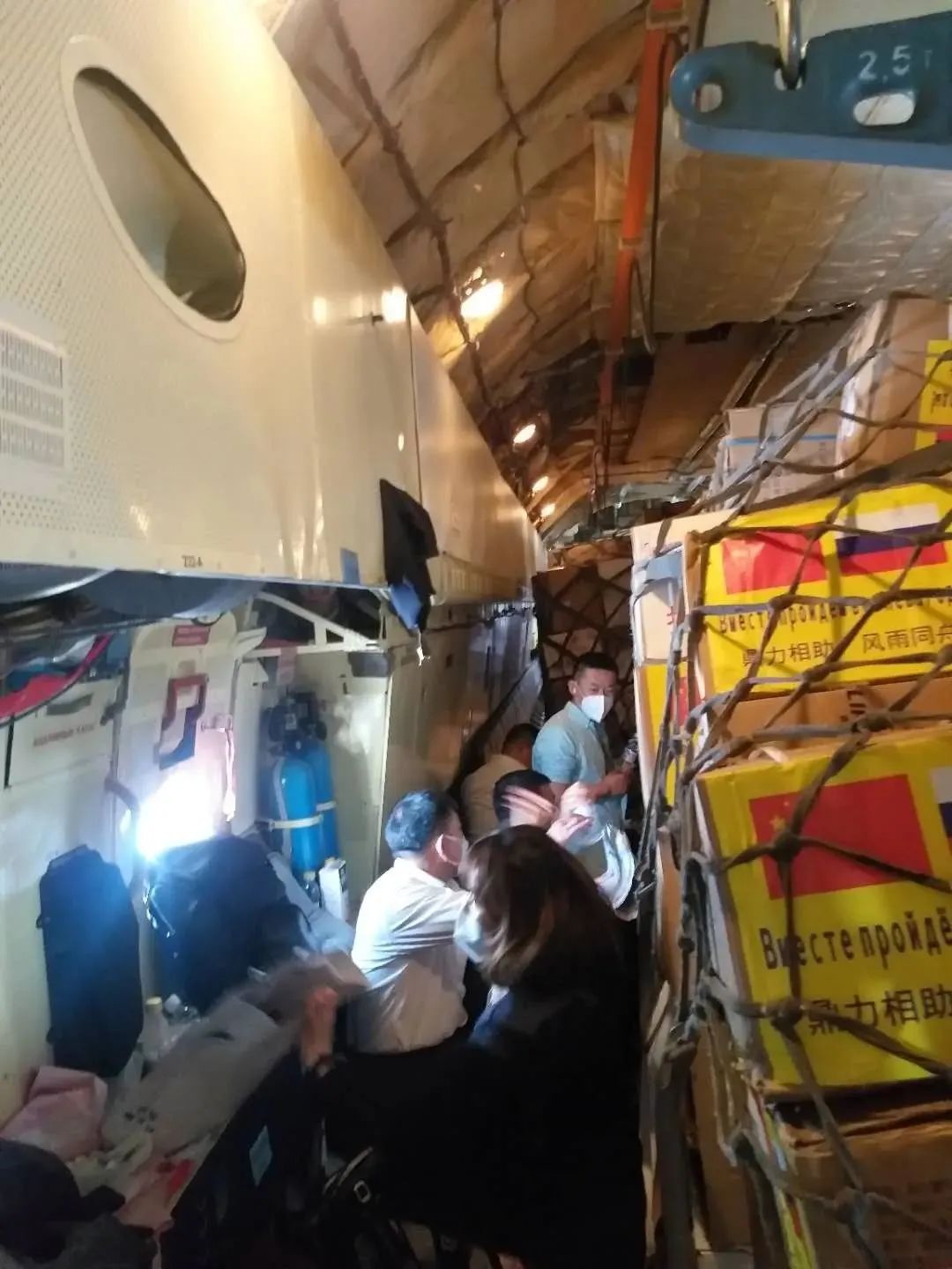 抗疫物資高高堆起,幾乎占滿了整個(gè)機(jī)艙