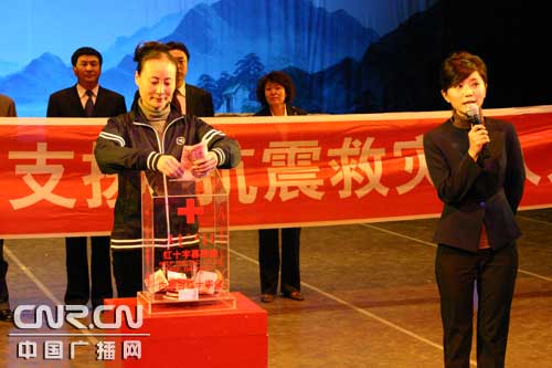 正式的捐款儀式在演出中場(chǎng)開始,演員們放棄了休息時(shí)間,為四川災(zāi)區(qū)籌集善款,F(xiàn)場(chǎng)觀眾也再次為四川災(zāi)區(qū)施以援手,有很多捐款的觀眾都讓自己的孩子親手將善款放進(jìn)“ 愛心箱”,她們說,“帶孩子來看芭蕾舞是為讓她們受到藝術(shù)的熏陶,但更應(yīng)該讓孩子有一顆懂得愛的心!币晃恍∨笥褜(duì)著話筒用稚嫩的聲音說:“那里的小朋友正可憐,都被壓在房子下面了。”