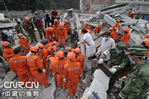 5月16日中午,內(nèi)蒙古消防赴川抗震搶險救援隊救援工作調(diào)整到鎮(zhèn)內(nèi)兩條街道上的居民區(qū),救援隊分成35個小組,重點對居民住宅和確認(rèn)有人埋壓的區(qū)域進行搜救。