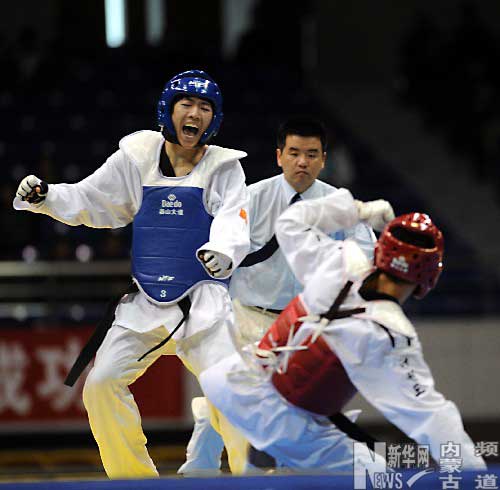 3月17日,在全國跆拳道錦標賽暨第二十九屆奧運會選拔賽男子62公斤級決賽中,內(nèi)蒙古選手朱圣鵬(左)戰(zhàn)勝上海選手張璇璇,獲得冠軍。 新華社記者范長國攝