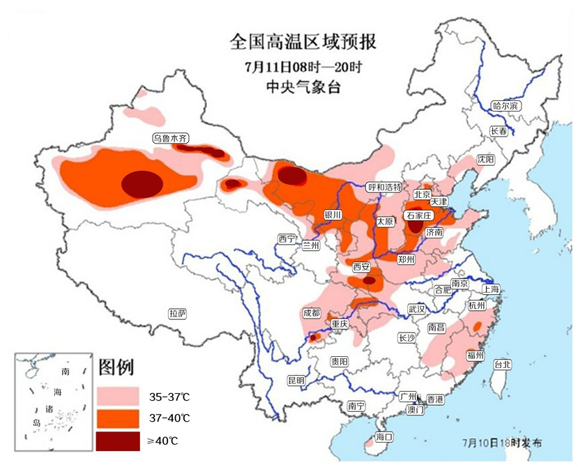 中央氣象臺(tái)7月10日18時(shí)繼續(xù)發(fā)布高溫黃色預(yù)警:預(yù)計(jì),7月11日白天,華北中南部、黃淮、西北地區(qū)東部、內(nèi)蒙古西部、甘肅中西部、新疆南疆盆地、四川盆地、湖北西部以及浙江中南部、福建、江西東部等地有35℃以上的高溫天氣,其中,河北中南部、河南北部、山東北部、內(nèi)蒙古西部、甘肅西部、寧夏、山西西南部、陜西關(guān)中地區(qū)和南部、浙江南部、福建東部以及新疆南疆盆地等地的部分地區(qū)最高氣溫可達(dá)37-39℃,局地可超過(guò)40℃。(記者吳冰清)