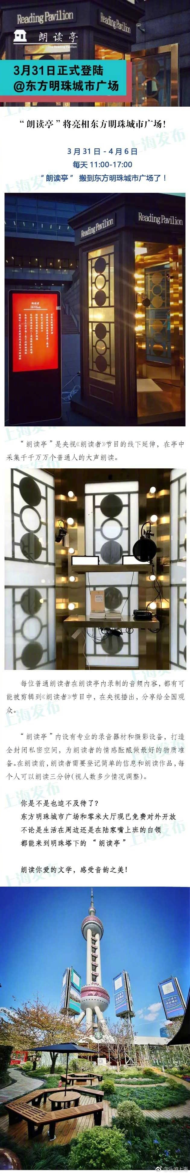 央廣網(wǎng)上海3月30日消息 據(jù)樂游上海發(fā)布稱,熱愛朗讀的小伙伴注意!繼徐匯濱江西岸之后,網(wǎng)紅“朗讀亭”又于3月31日至4月6日亮相東方明珠城市廣場,你可以在“朗讀亭”里將經(jīng)典文選讀給親友或自己,感受讀書的樂趣。