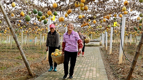 連綿起伏的藤架下,掛滿了金燦燦、綠油油、沉甸甸的瓜蔞果實(shí)。